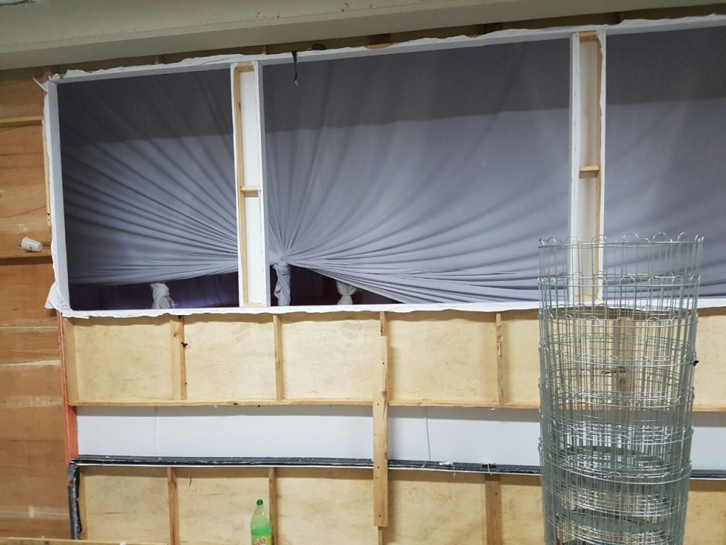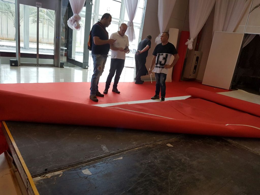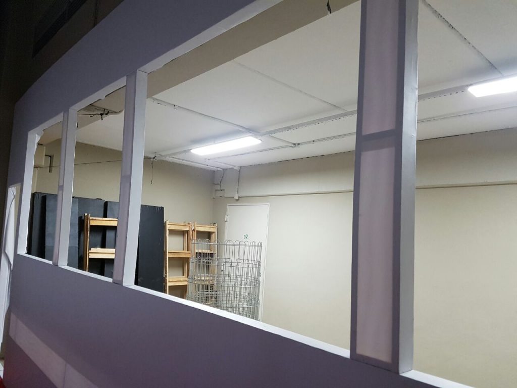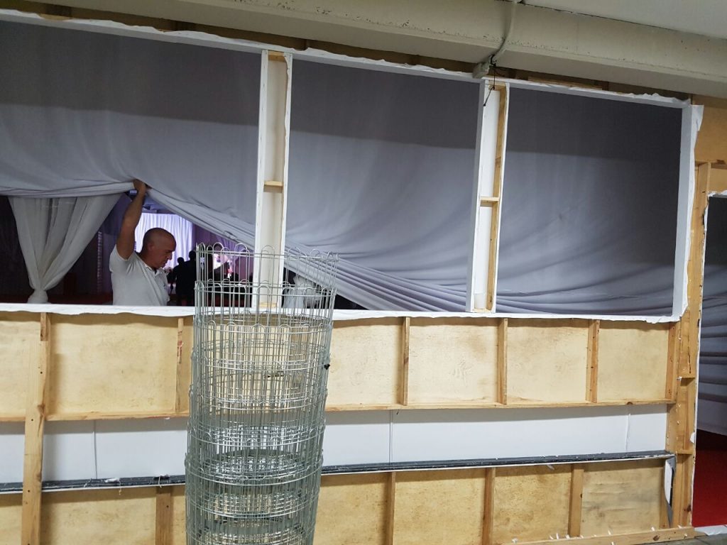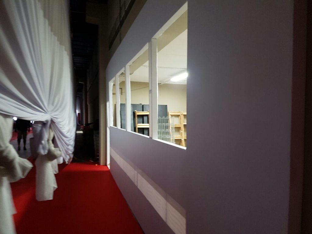 Realizamos a montagem do Palco e aplicamos a forração em carpete. Para esse projeto foi desenvolvido um  guarda corpo com acabamento decorativo em lycra para o Bar. A Chapelaria foi construída em madeira com acabamento em Bagum, acrescentamos algumas prateleiras. A execução do fechamento de paredes foi em tecido lycra, já as salas de produção foram construídas em madeira com acabamento em Bagum.